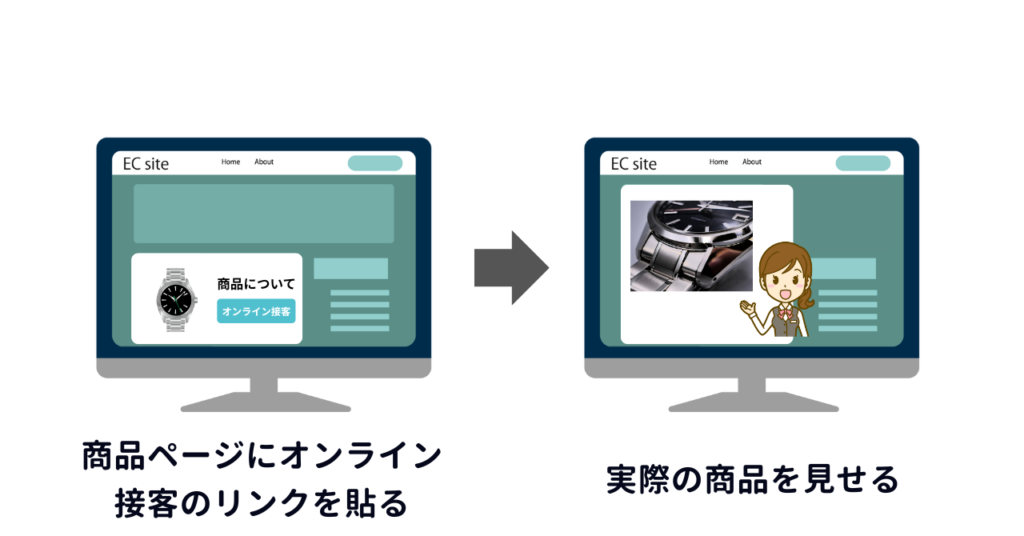 LiveCallを活用すれば、商品ページに「オンラインで相談する」「スタッフに質問する」といったリンクを設置するだけで、ワンクリックでビデオ通話を開始できます。