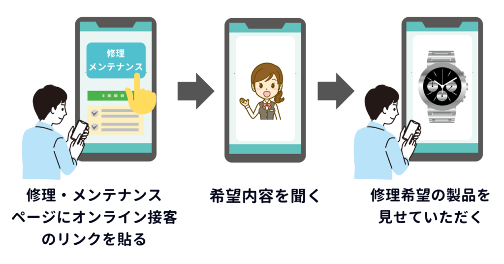 お客様は、スタッフと通話しながら修理したい製品をカメラ越しに見せることができ、スタッフはその場で状態を確認し、修理内容や見積もりを案内します。