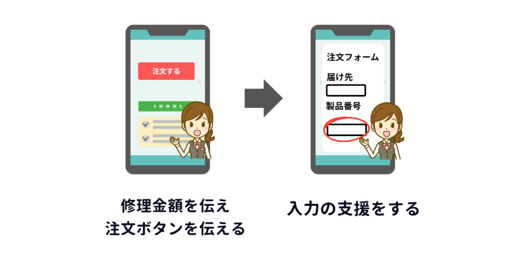 修理金額や納期が確定したら、スタッフはそのまま注文画面へ誘導し、コブラウズ機能(画面共有・操作支援)を使って入力フォームのサポートを行います。